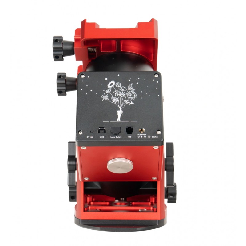 La selle double standard accepte les queues d’aronde Losmandy et Vixen. La gestion des câbles est intégrée grâce aux ports USB C et alimentation DC présents directement sur la selle, réduisant fortement l’encombrement des câbles sur le setup. La monture intègre également un frein mécanique sur l’axe AD, une position zéro mécanique, la fonction Park et un système de rangement pour la clé hexagonale magnétique.