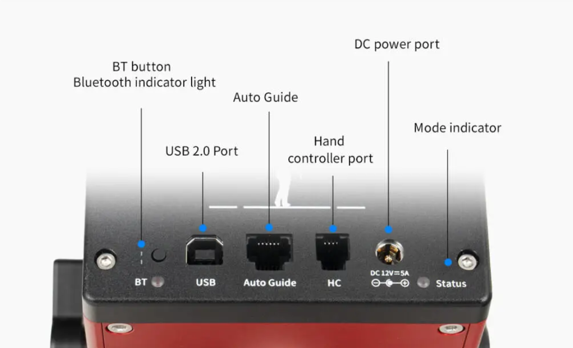 La connectivité comprend USB, WiFi, Bluetooth, port ST4 ainsi qu’une raquette intelligente avec joystick, hotspot WiFi intégré, interface Web de configuration et mise à jour firmware. La compatibilité native avec ASIAIR permet une intégration directe dans l’écosystème ZWO sans complexité logicielle.