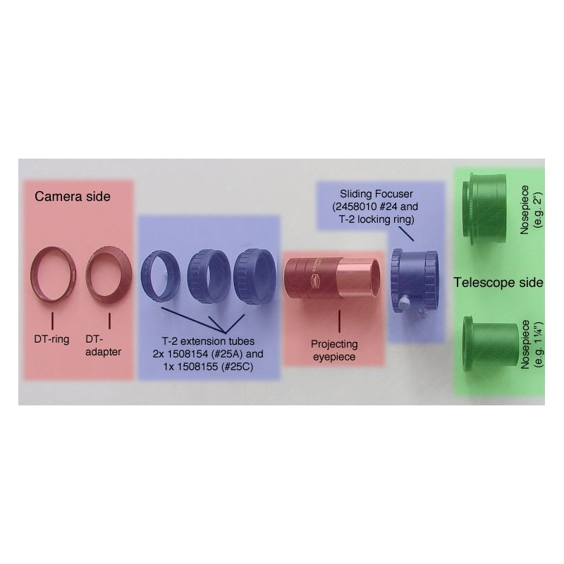 Le système comprend également trois bagues d’extension T-2 (2x15 mm et 1x7.5 mm), permettant d’ajuster la distance exacte entre l’oculaire et l’objectif de la caméra. Il est ainsi possible d’optimiser le champ photographié en fonction des besoins de chaque instrument. Grâce à cette configuration modulaire, le système ADPS V convient aussi bien à des compacts numériques qu’à des caméras spécialisées ou caméscopes dotés de filetage frontal (via adaptateur DT en option).