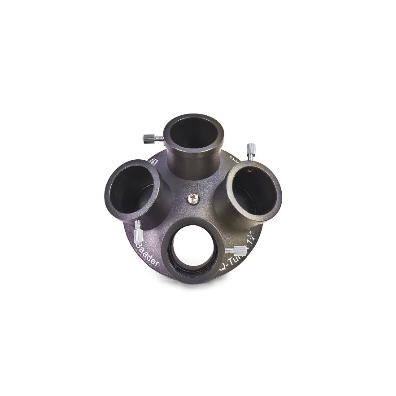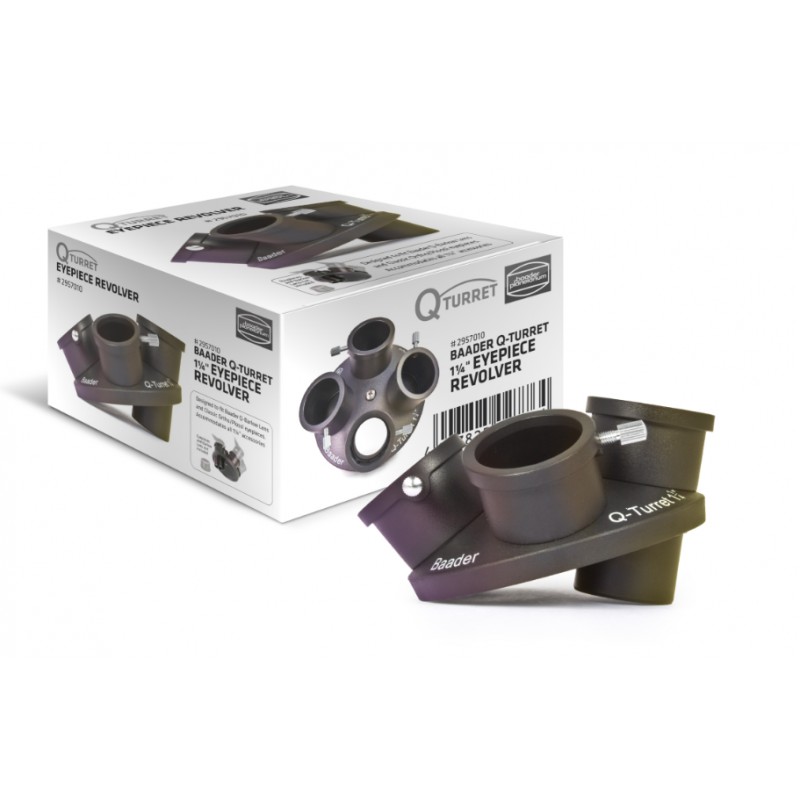 Le Baader Planetarium Q-Turret est un revolver pour oculaires 1,25 pouce permettant de changer rapidement d’oculaire ou d’utiliser une caméra planétaire. Compatible avec la plupart des lunettes, télescopes Schmidt-Cassegrain et Newton disposant d’un tirage suffisant, il combine légèreté, robustesse et filetages métalliques.