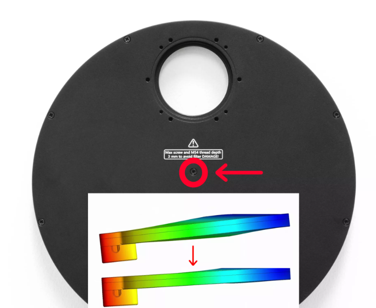 La rigidité mécanique est améliorée grâce à une vis de fixation centrale, en complément des vis périphériques, réduisant la déformation de moitié par rapport aux conceptions classiques. La roue est compatible avec de nombreuses caméras et diviseurs optiques hors axe des marques ZWO, QHY, ToupTek, PlayerOne APS-C et plein format, ainsi qu’avec la majorité de leurs accessoires. Une gorge spécifique est prévue pour les caméras QHYCCD sans augmentation du backfocus.