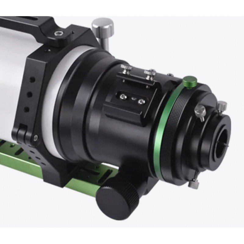 Le 107PHQ repose sur des composants usinés CNC avec un revêtement lisse et soigné. Des éléments décoratifs verts viennent souligner son design. Son porte-oculaire rigide de 3,4″ peut supporter jusqu’à 8 kg, et sa course de mise au point de 95 mm le rend adapté à l’observation comme à l’astrophotographie.