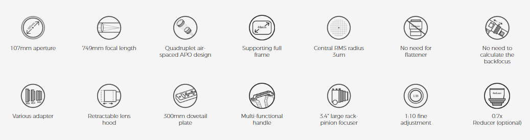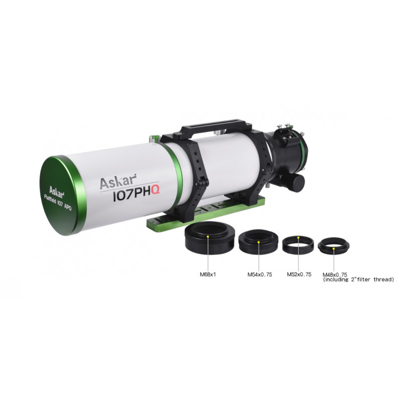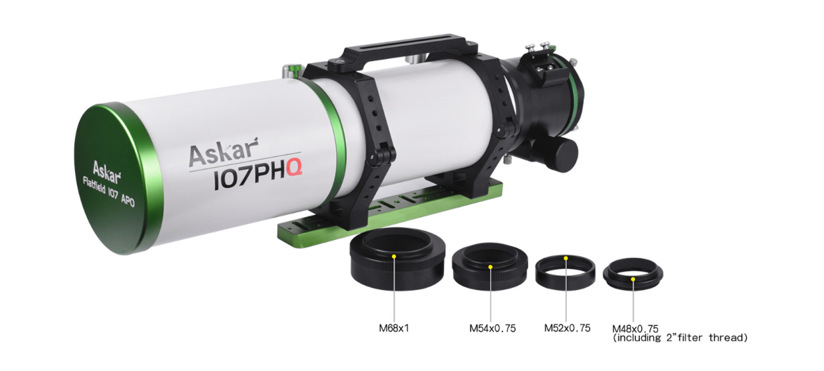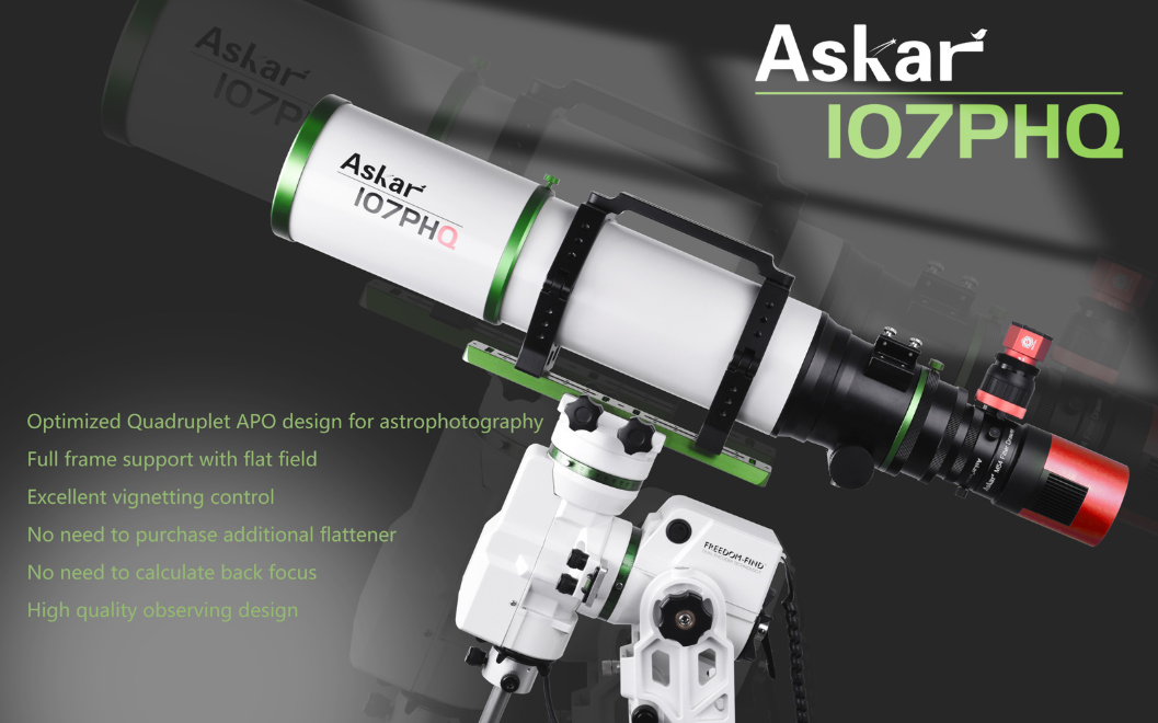 Le 107PHQ est le premier astrographe Askar à longue focale doté d’une optique à champ corrigé. Il a été conçu pour répondre aux besoins des débutants comme des astrophotographes expérimentés : il est simple à utiliser, polyvalent et esthétiquement abouti. Il est particulièrement adapté aux amateurs puisqu’il ne nécessite pas de correcteur de champ supplémentaire pour obtenir une image plane et nette. Sans correcteur à installer ni calcul de tirage à effectuer, il suffit de lui associer vos accessoires d’imagerie, de faire la mise au point, et l’ensemble optique est immédiatement opérationnel.