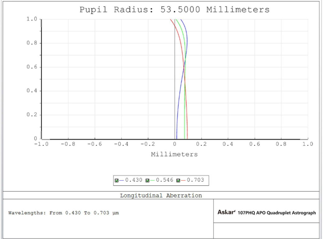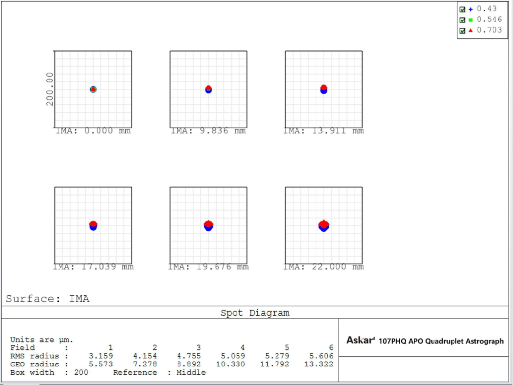 Son optique intégrée à champ corrigé contribue fortement à ses performances en imagerie. Il prend en charge le format plein cadre de 44 mm et montre très peu de déformation des étoiles en bord de champ. Au centre, le rayon RMS n’est que de 3 micromètres, satisfaisant même les observateurs les plus exigeants. Le 107PHQ maîtrise également bien la courbure de champ et le vignettage.