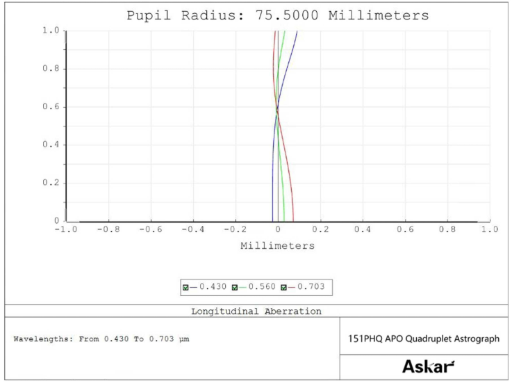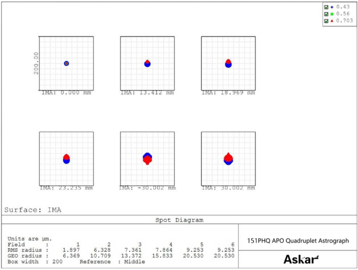 Sa formule optique quadruplet intégrant deux éléments en verre ED corrige efficacement l’aberration chromatique, supprime les déformations hors axe et délivre des étoiles d’une pureté impressionnante. Grâce à son optique à champ corrigé intégrée, le 151PHQ supporte un cercle image de 60 mm, adapté aux capteurs moyen format, tout en maintenant un RMS central inférieur à deux microns, une signature éloquente de précision.