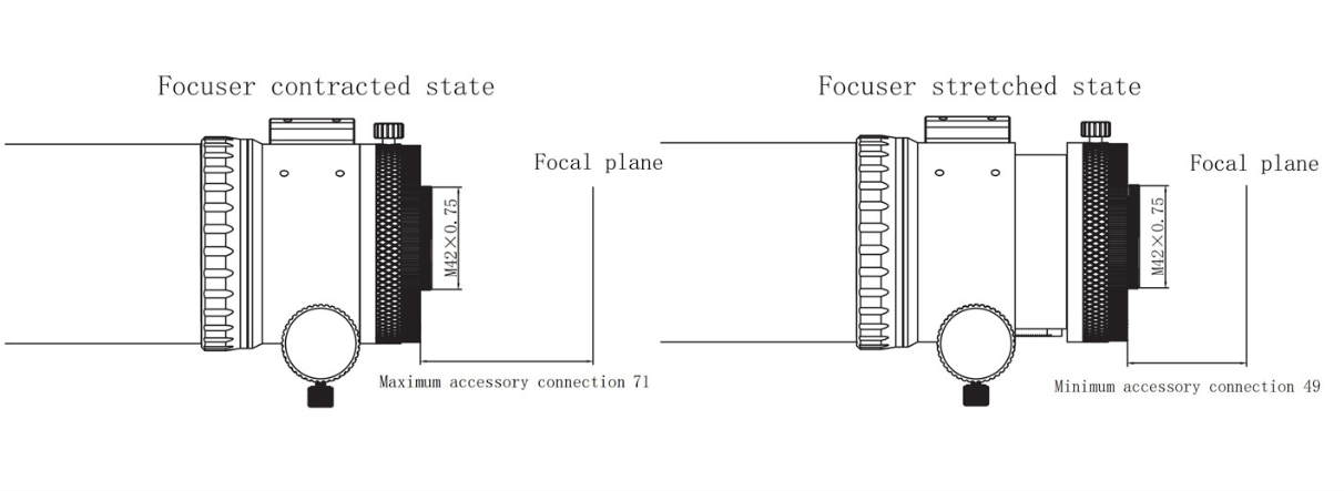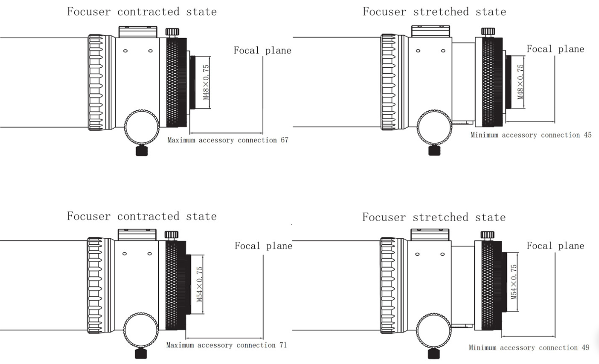 Le porte oculaire est un modèle rigide à crémaillère de 2,5 pouces, solide et raffiné. Il dispose d’une mise au point double vitesse avec réglages grossier et micrométrique. Un adaptateur universel M48 × 0,75 est fourni ainsi que des adaptateurs M54 × 0,75 et M42 × 0,75 pour connecter facilement divers systèmes d’imagerie. Un rotateur intégré à 360 degrés permet d’orienter aisément le cadrage.